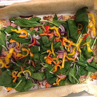 When the hash brown crust is ready start layering by evenly spreading the slices of kielbasa, next the spinach, pepper, and onion, then cheese. Pop it back in the oven until the eggs are cooked and the cheese is melted.
